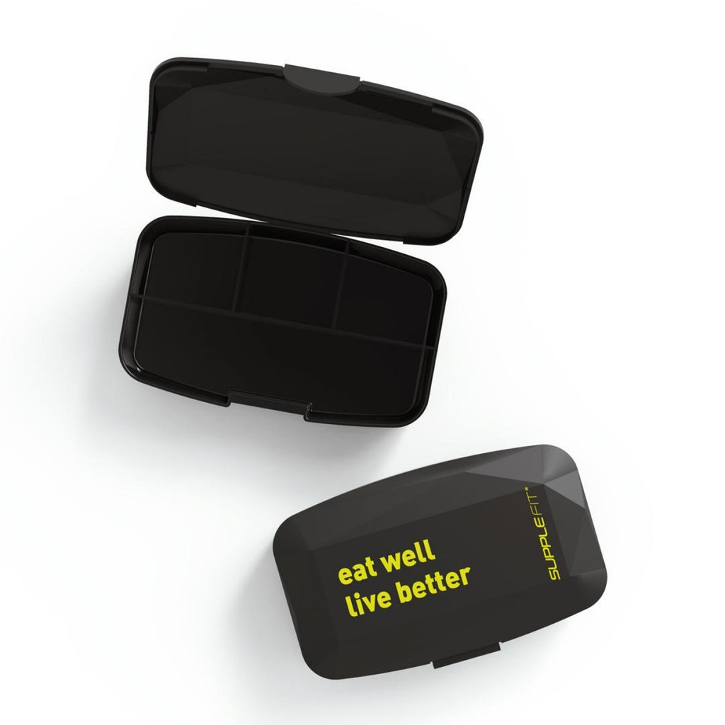Compact et pratique, ce pilulier au design noir transparent tient facilement dans un sac, une poche ou un sac de sport. Conçu pour un usage quotidien, il est parfaitement adapté aux programmes nutritionnels SuppleFit et à toutes les routines bien-être.
